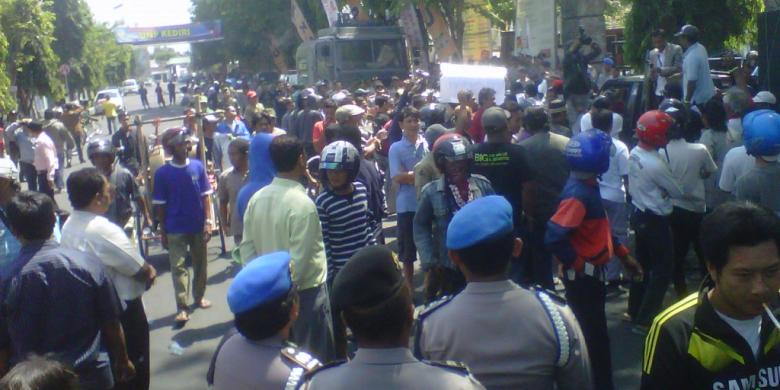 KEDIRI, KOMPAS.com - Polisi menutup akses ke jalan raya di depan Kantor Komisi Pemilihan Umum Kota Kediri, Jawa Timur, Rabu (5/9/2013), menyusul unjuk rasa massa yang kecewa dengan hasil Pemilihan Wali Kota Kediri.